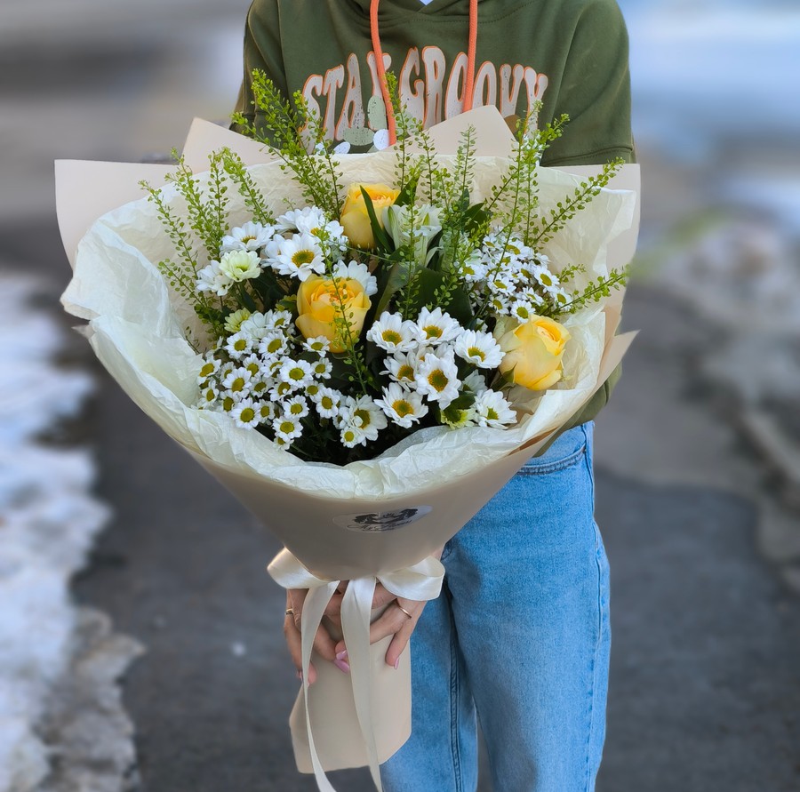 Превосходное качество — каждый стебель, каждый бутон проходят строгий отбор. Наши мастера работают только со свежесрезанными цветами высшего сорта, чтобы ваша композиция радовала глаз как можно дольше.