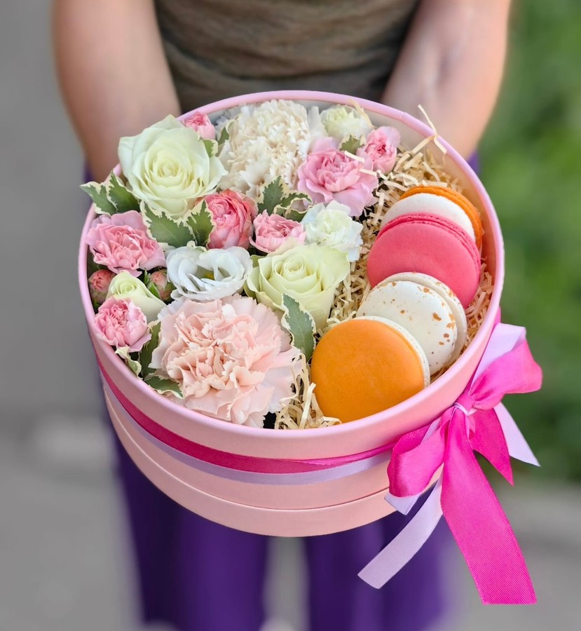 Это изысканная композиция в стильной шляпной коробке , разделенном на две гармоничные зоны. В одной части утопают в зелени свежесрезанные бутоны , подобранные в мягкой цветовой гамме. В другой — аккуратно выложены французские макаронс с хрустящей корочкой и нежным ганашем, чей оттенок идеально перекликается с цветом лепестков.